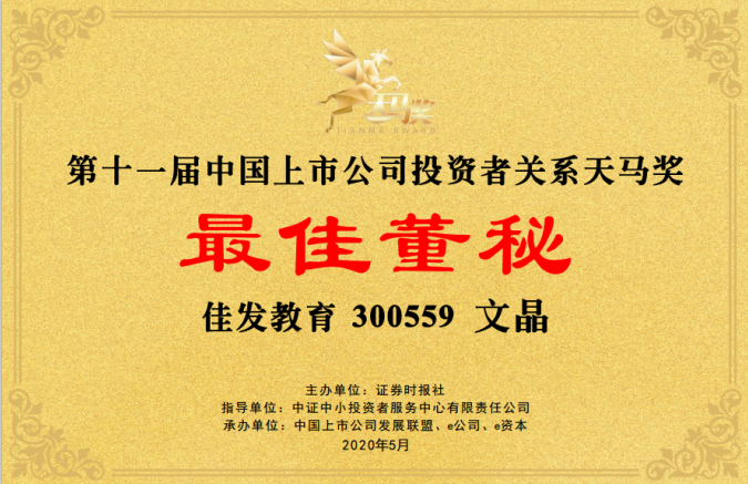 谢谢主理方、羁系机构、媒体以及宽大投资者对尊龙抖圈官网教育的支持和认可。。。。。。此次获奖不但是一份声誉,,,,,更是一份责任。。。。。。公司将以“智慧招考”和“智慧教育”营业为着力点,,,,,钻营转型升级、实现立异生长,,,,,继续在社会各界的体贴和资助下,,,,,推动周全提升公司治理水平,,,,,做好投资者关系治理事情顶层设计,,,,,实现公司生长战略和谋划状态的有用转达,,,,,知足投资者多元化需求,,,,,提高投资者信托和信心,,,,,为客户、股东创立更多价值。。。。。。